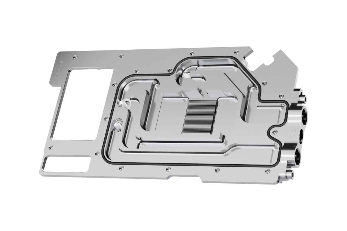 - Gezielte Flow-Führung: Die interne Kühlkanalstruktur sorgt für die hocheffiziente Kühlung von GPU, VRAM und Spannungswandlern.