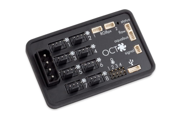The OCTO fan control gets its power from a 4-pin Molex power supply. Information and data are directly transmitted to the mainboard via USB 2.0 to be read out in aquasuite. The software can also be used to adjust the finer details in order to optimize your system.