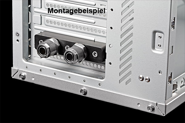 The Panama HF38 consists of three components and can be installed tool-free. Simply fixate the slot cover like and other. The inner part is then connected to the outer part and screwed together. They seal safely with two O-ring seals. Use G3/8" fittings of your choice. The neighboring slots are not obstructed by this slot cover! We recommend using the lowest free slot for easy tubing management.
