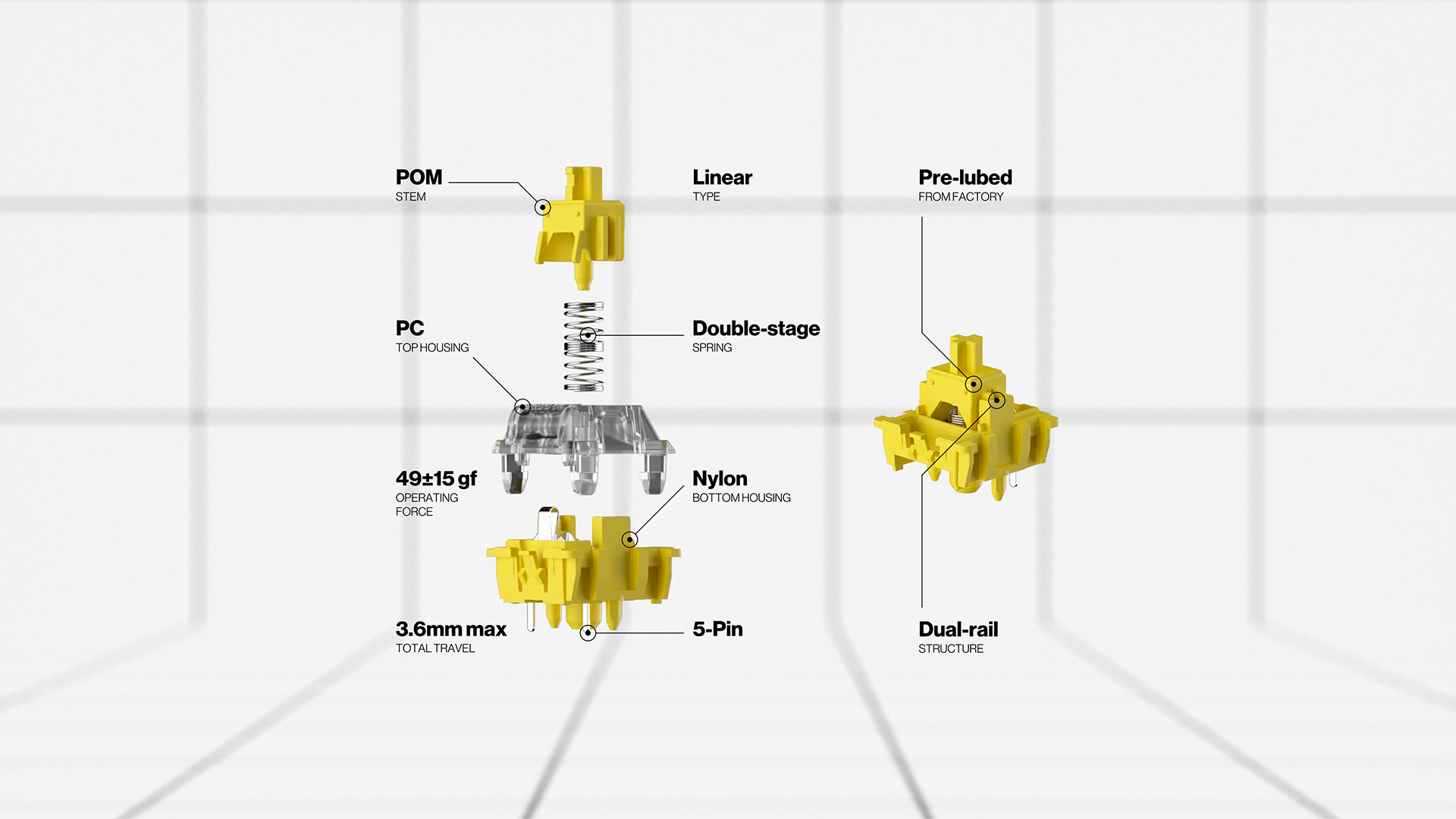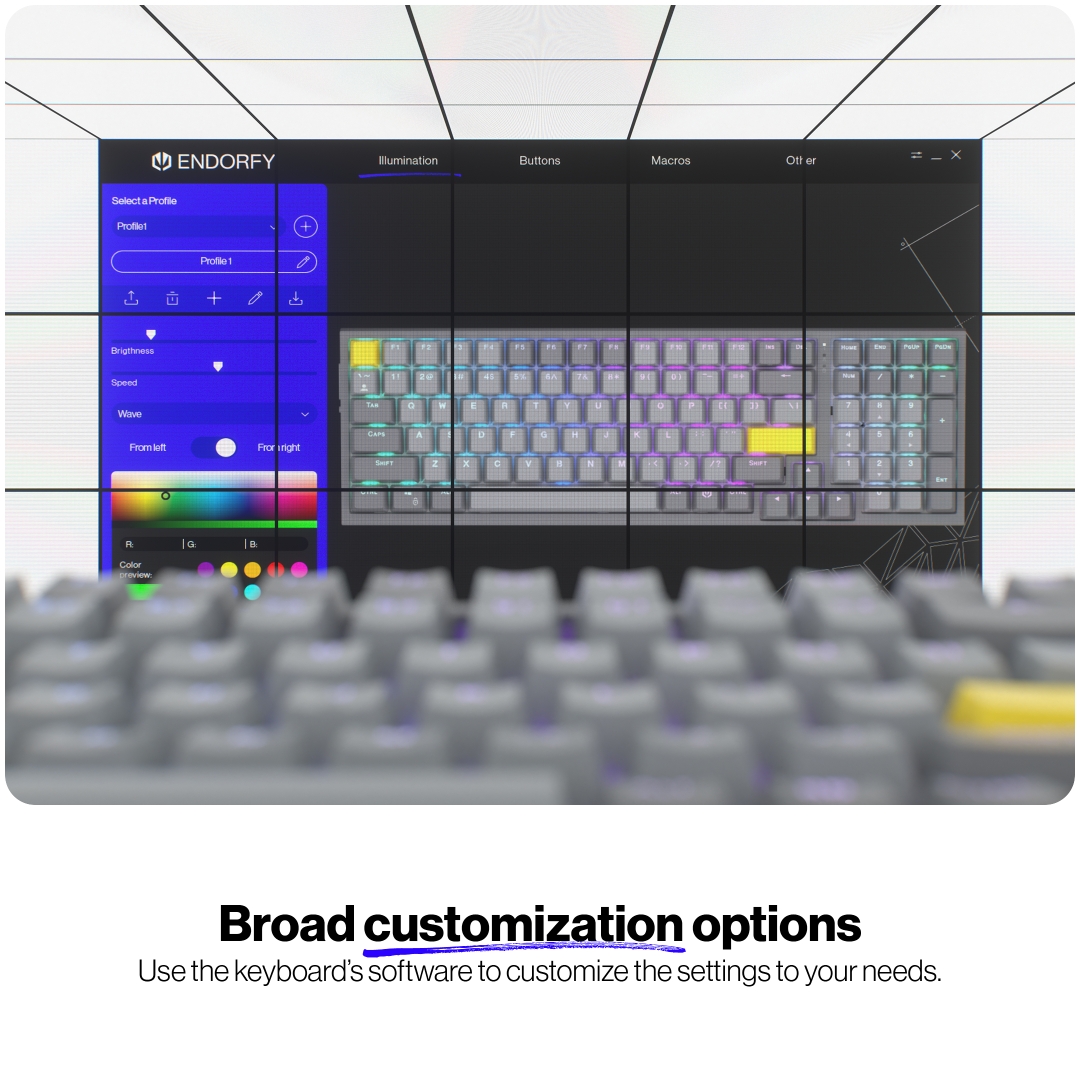 - ENDORFY Yellow by Gateron: Factory-lubed linear switches provide a silky-smooth travel and exceptional precision for fast typing.