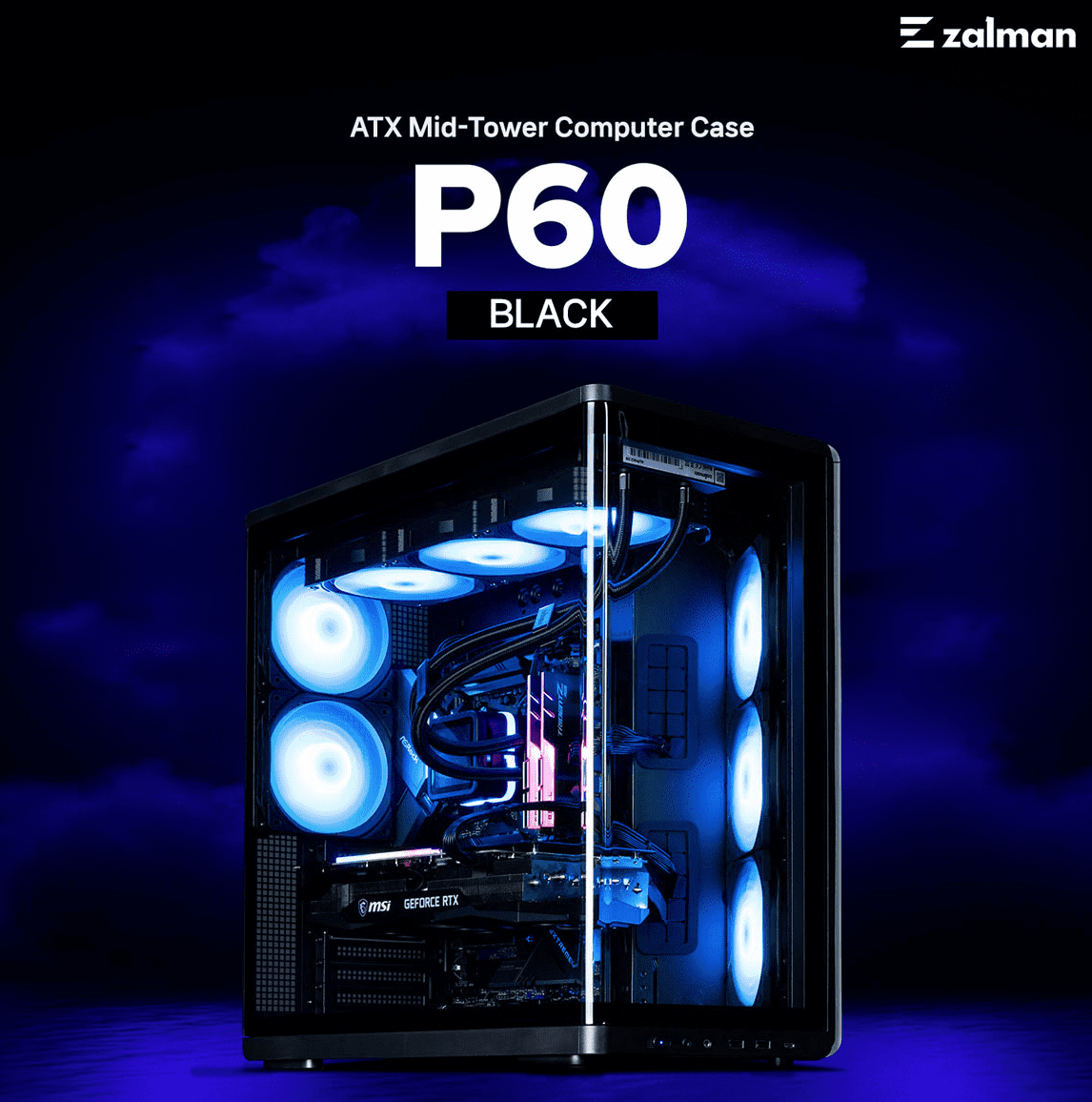Der Zalman P60 black ist ein stilvoller ATX-Mid-Tower, der modernes Design mit leistungsfähiger Kühlung kombiniert. Das schwarze Gehäuse mit großflächiger Glasseitenwand und fünf vorinstallierten ARGB-Lüftern bietet es sowohl Ästhetik als auch Funktionalität – ideal für Gamer, Content-Creator und PC-Enthusiasten, die Wert auf Optik und Performance legen.