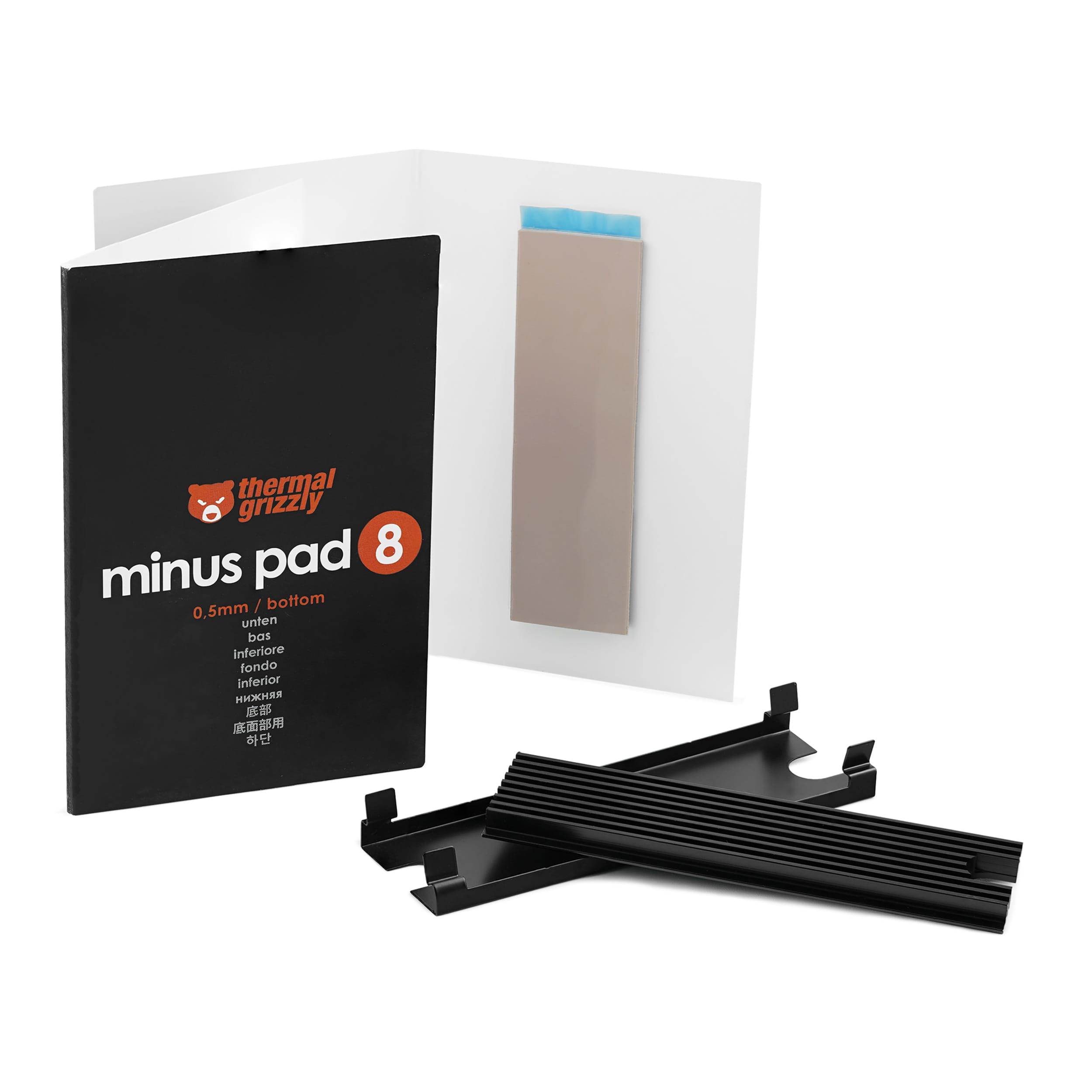 La conception bien pensée du refroidisseur se compose d'un couvercle avant et d'une plaque arrière, ainsi que de deux coussinets thermiques haute performance Minus Pad 8 assortis. Il convient de noter que le refroidisseur SSD M.2 Thermal Grizzly n'est compatible qu'avec les SSD NVMe M.2 à simple face d'une largeur de 22 millimètres et d'une longueur de 80 millimètres, et que des connecteurs M.2 (NGFF) d'une hauteur de 4,2 millimètres doivent être utilisés.