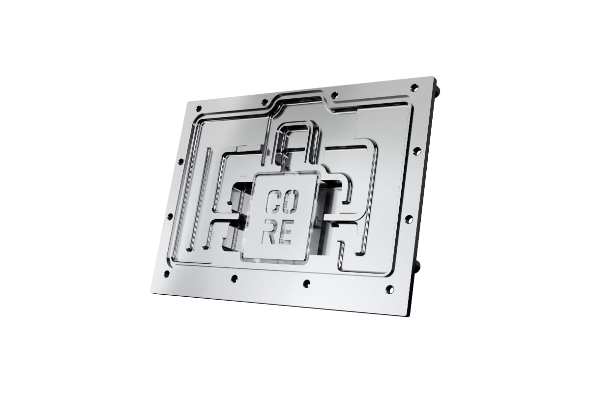 Die optische Gestaltung des GPU-Wasserkühlers wurde nur geringfügig verändert. Ein besonderes Highlight ist das neu hinzugekommene Core-Emblem über der Jetplate, dass die Zugehörigkeit zur Core-Serie unterstreicht und das Design visuell aufwertet. Die Serie setzt weiterhin auf hochwertige Messinganschlüsse, die optimale Qualität und Sicherheit garantieren. Die speziell angepasste Aluminium-Backplate bedeckt die komplette Rückseite des Kupferkühlers und sorgt für eine klare und einheitliche Optik. Das Acryl, in Kombination mit der aRGB-Beleuchtung, ermöglicht eine gleichmäßige und beeindruckende Beleuchtung des gesamten Kühlers.