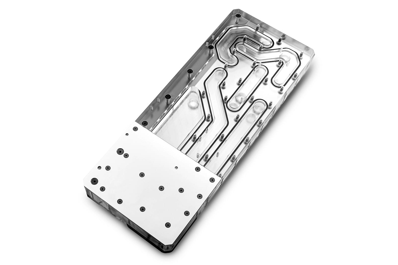 The EK-Quantum Reflection Fractal ATX D5 PWM D-RGB offers multiple industry-standard G1/4" threaded inlet and outlets. The placement of these inlets and outlets is perfectly aligned to fit inline with the PC components in order to minimize the number of bends the user has to make in order to create the loop. It is able to support 1 CPU, 2 GPUs, and up to 2 radiators.