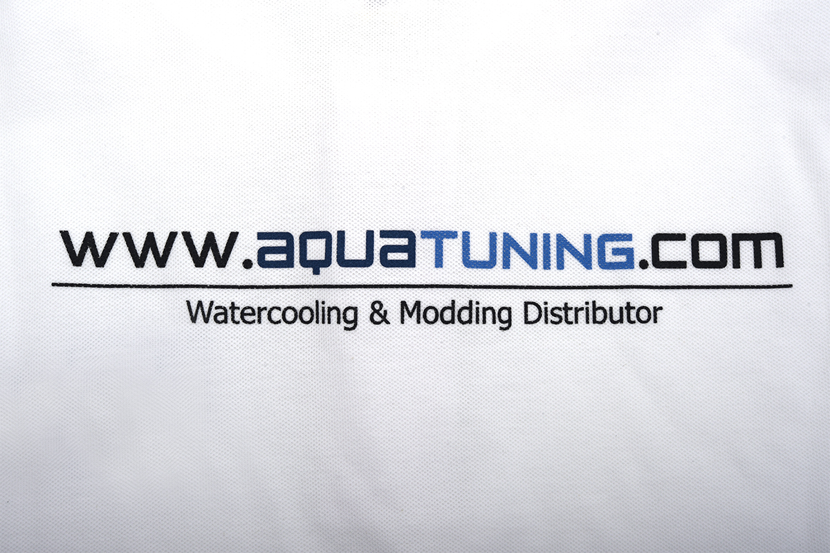The front has the Aquatuning printed onto it, the back has ''www.aquatuning.com'' and ''Watercooling and modding distributor'' printed onto it.