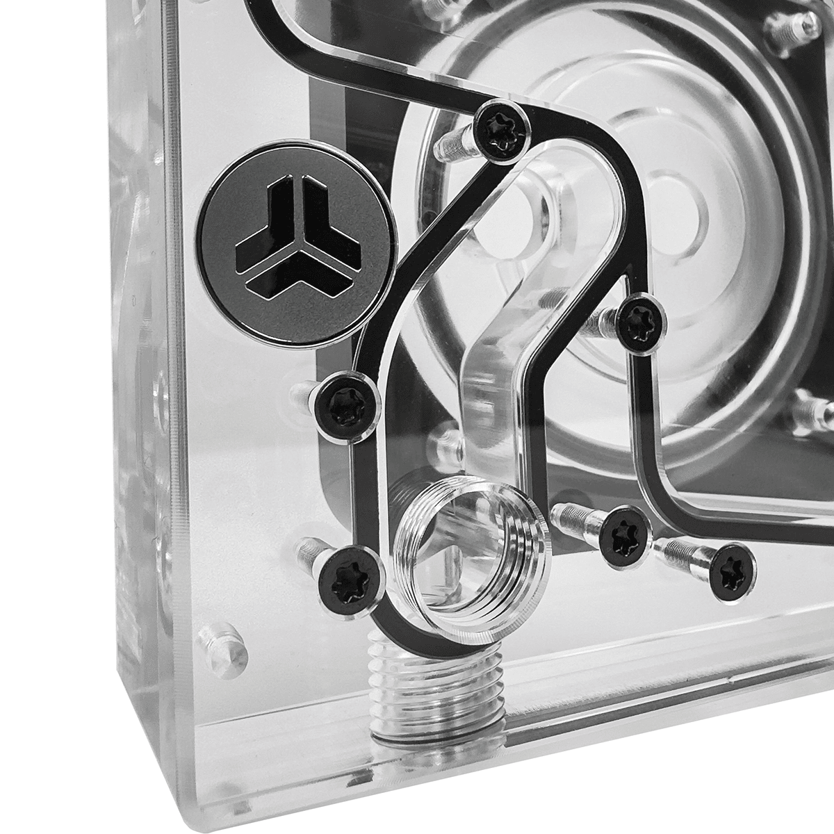 With a height of only approximately 95 mm, this ultra-compact system seamlessly combines a reservoir and pump mount into one elegant unit. It offers unbeatable flexibility by supporting both the D5 or DDC pump (sold separately) and features integrated D-RGB lighting for stylish accents.