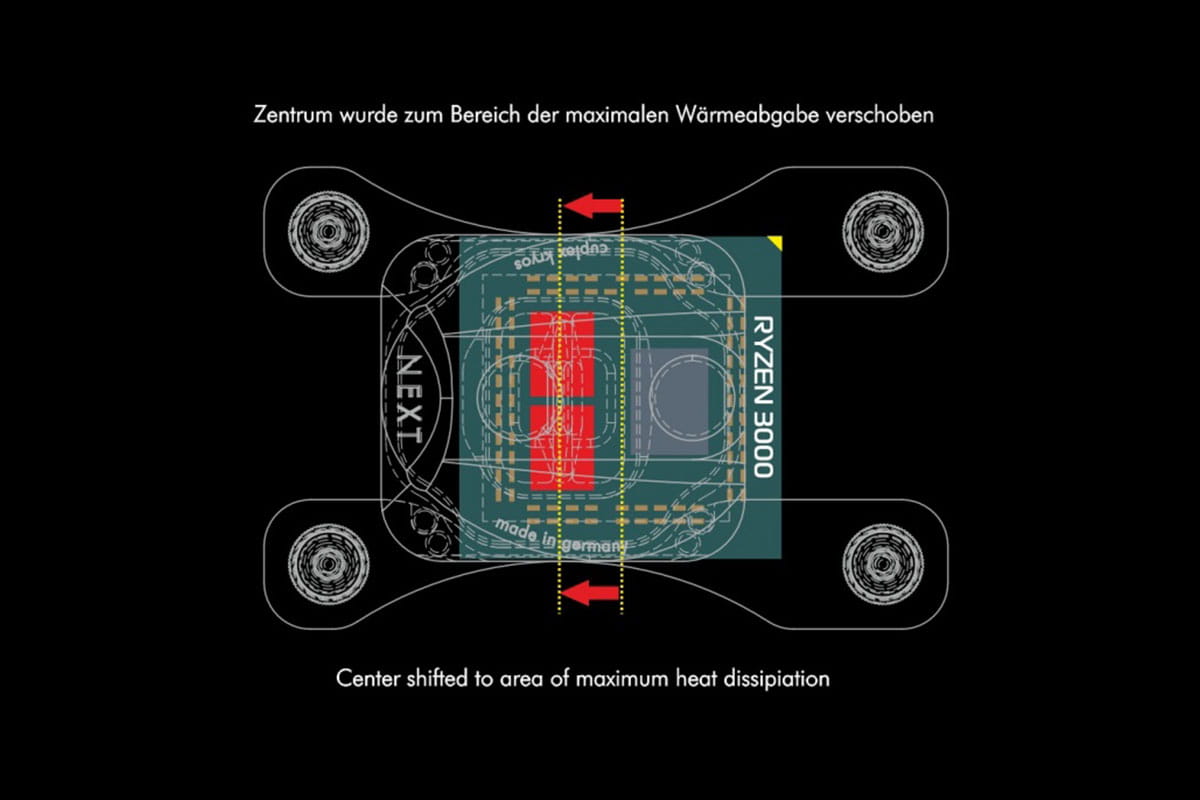 A seconda della variante, la base del radiatore è in rame, rame nichelato o argento sterling .925. Grazie all'ugello piatto integrato nell'alloggiamento del radiatore, il liquido refrigerante può fluire in modo eccellente al centro della microstruttura fine e può quindi essere scaricato in due direzioni.