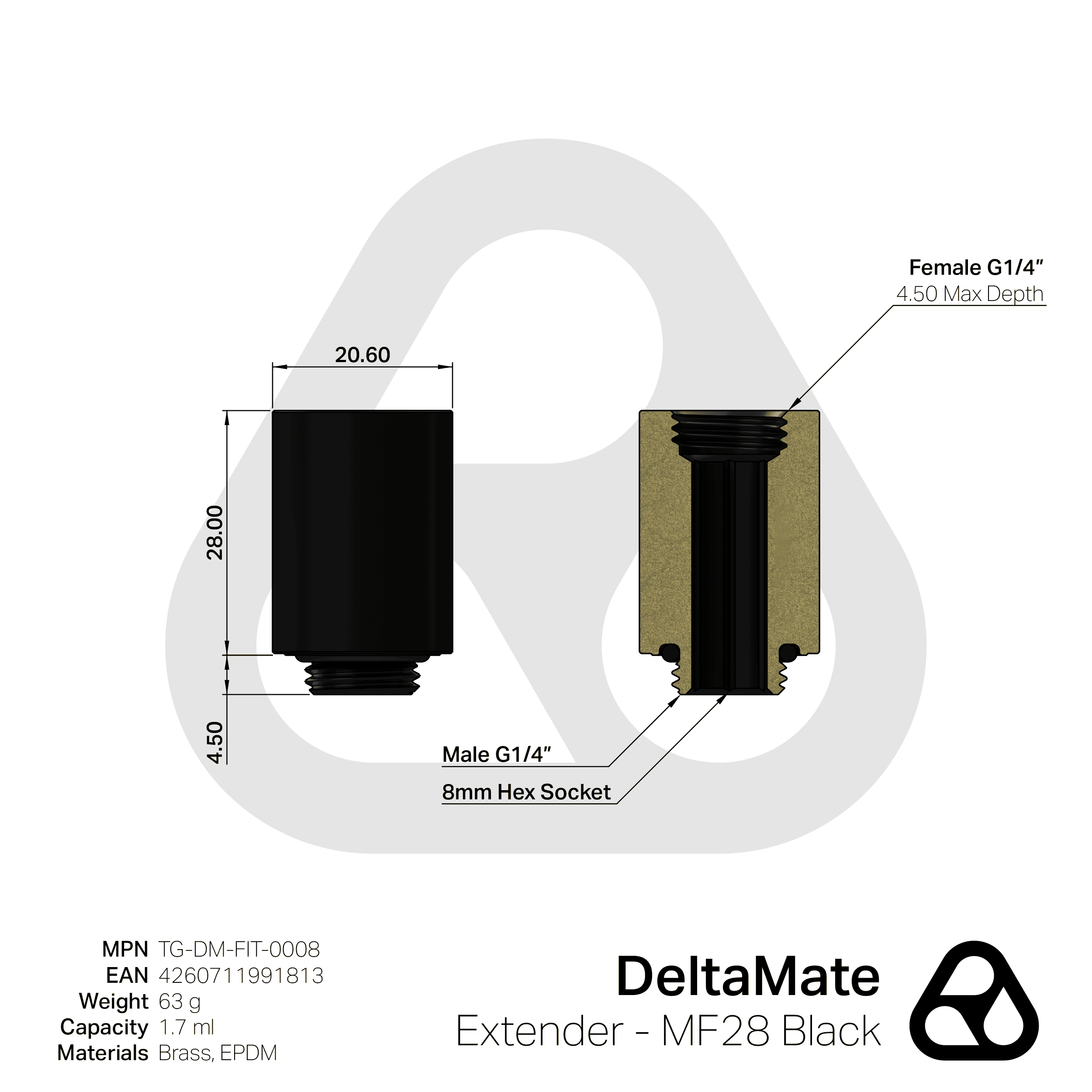 The DeltaMate Extender - MF28 features a G1/4-inch male and a G1/4-inch female thread. It serves as an extension fitting to increase the distance between components by a precise 28 mm. This length is often used to create space for RAM modules, fans, or two parallel tubes on the same plane. The matte black chrome finish provides a high-quality look that is also easy to clean. Thanks to the consistent outer diameter of all DeltaMate connectors, the products integrate seamlessly and aesthetically into your water cooling system.