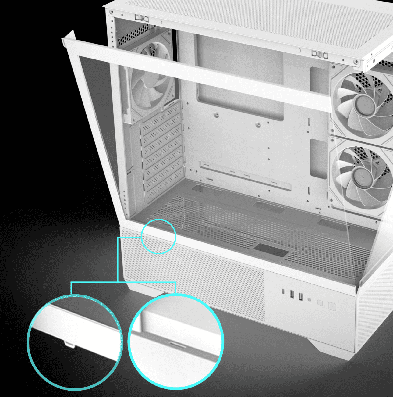 Seitenpanel und Frontabdeckung lassen sich ohne Werkzeug öffnen – für maximale Benutzerfreundlichkeit bei Montage und Wartung.