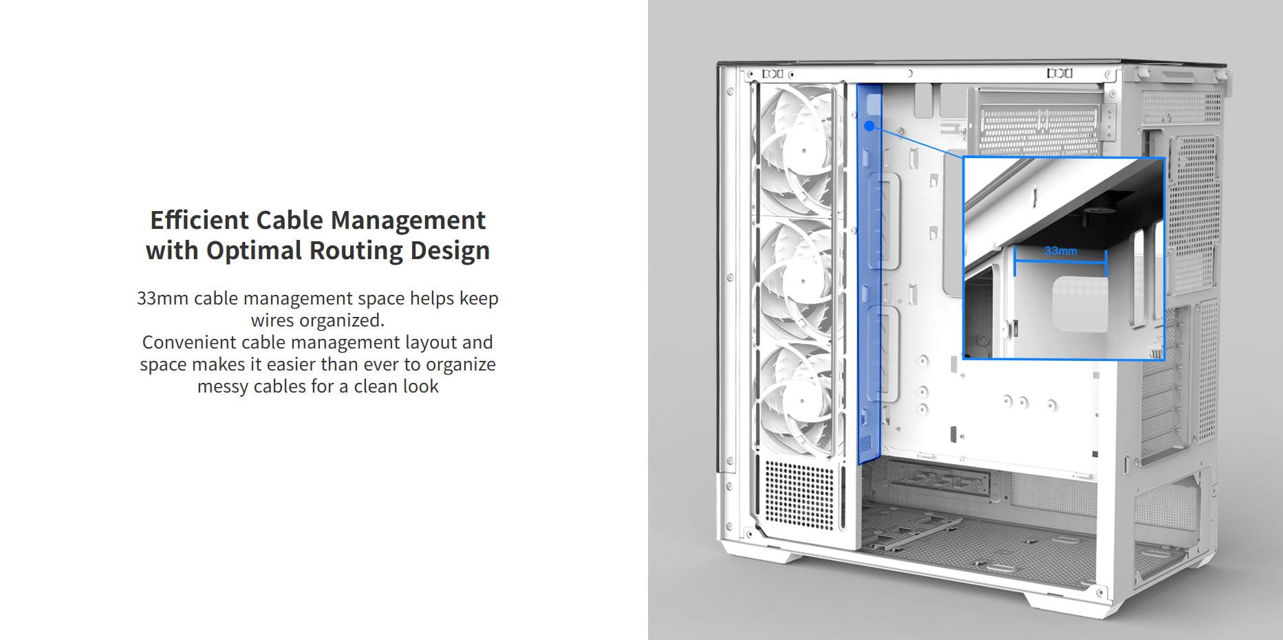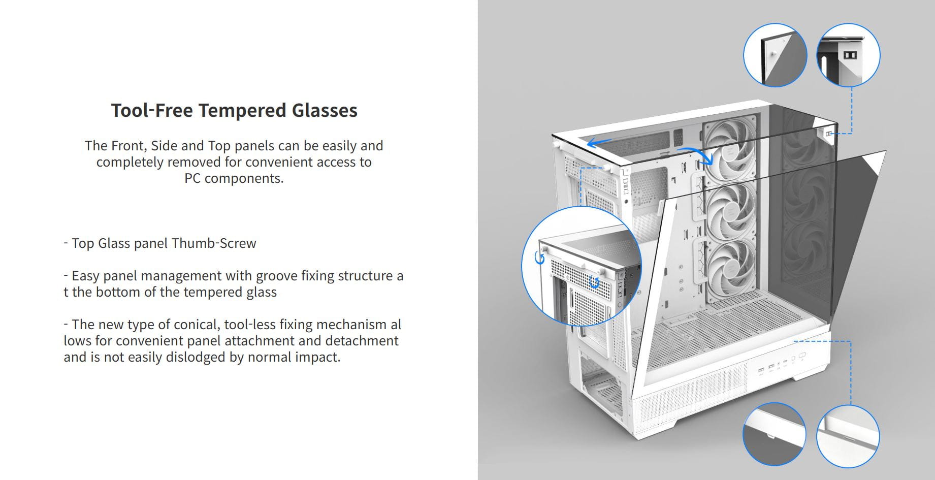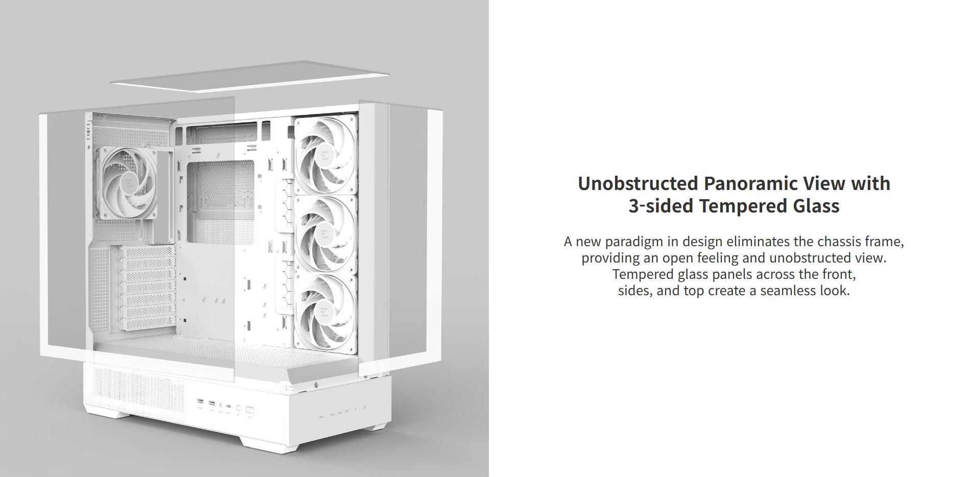 Das Zalman P40 Prism PLUS WHITE vereint modernes Design mit eindrucksvoller Beleuchtung. Die Front aus gehärtetem Glas wird von drei vorinstallierten 120-mm-ARGB-Lüftern in Szene gesetzt, die für eine beeindruckende Lichtshow sorgen. Auch das Seitenteil aus Tempered Glass lässt tief in das Innenleben blicken und setzt deine Komponenten perfekt in Szene – ganz egal ob im Gaming-Setup oder im stilvollen Arbeitsbereich.