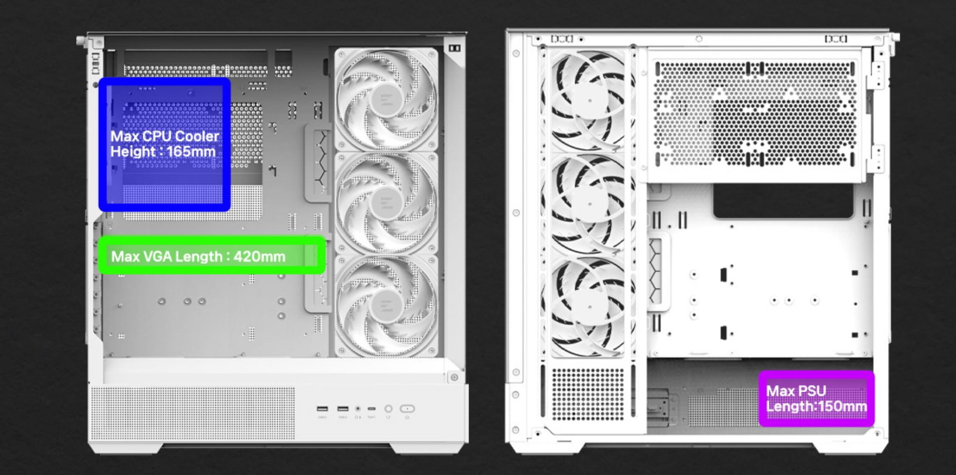 Mit Unterstützung für ATX-, mATX- und Mini-ITX-Mainboards, Grafikkarten bis 420 mm Länge und CPU-Kühler bis 165 mm Höhe bietet das Gehäuse großzügigen Raum für moderne Hardware. Zwei SSD-Halterungen, ein HDD-Käfig, ein aufgeräumtes Kabelmanagement-System und praktische Staubfilter machen den Einbau und die Pflege besonders komfortabel.
