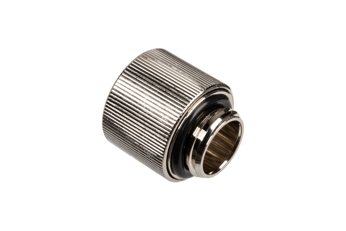 EK Water Blocks の 13/10mm ホースの接続は真鍮製の圧縮フィッティングです。カラーはニッケルシルバーで、シンプルなデザインが印象的なクラシックシリーズです。この継手では、ユニオン ナットが圧縮リングとして機能し、シール リングをホースに押し付けます。これは、高レベルのセキュリティと密閉性を提供することを意味します。