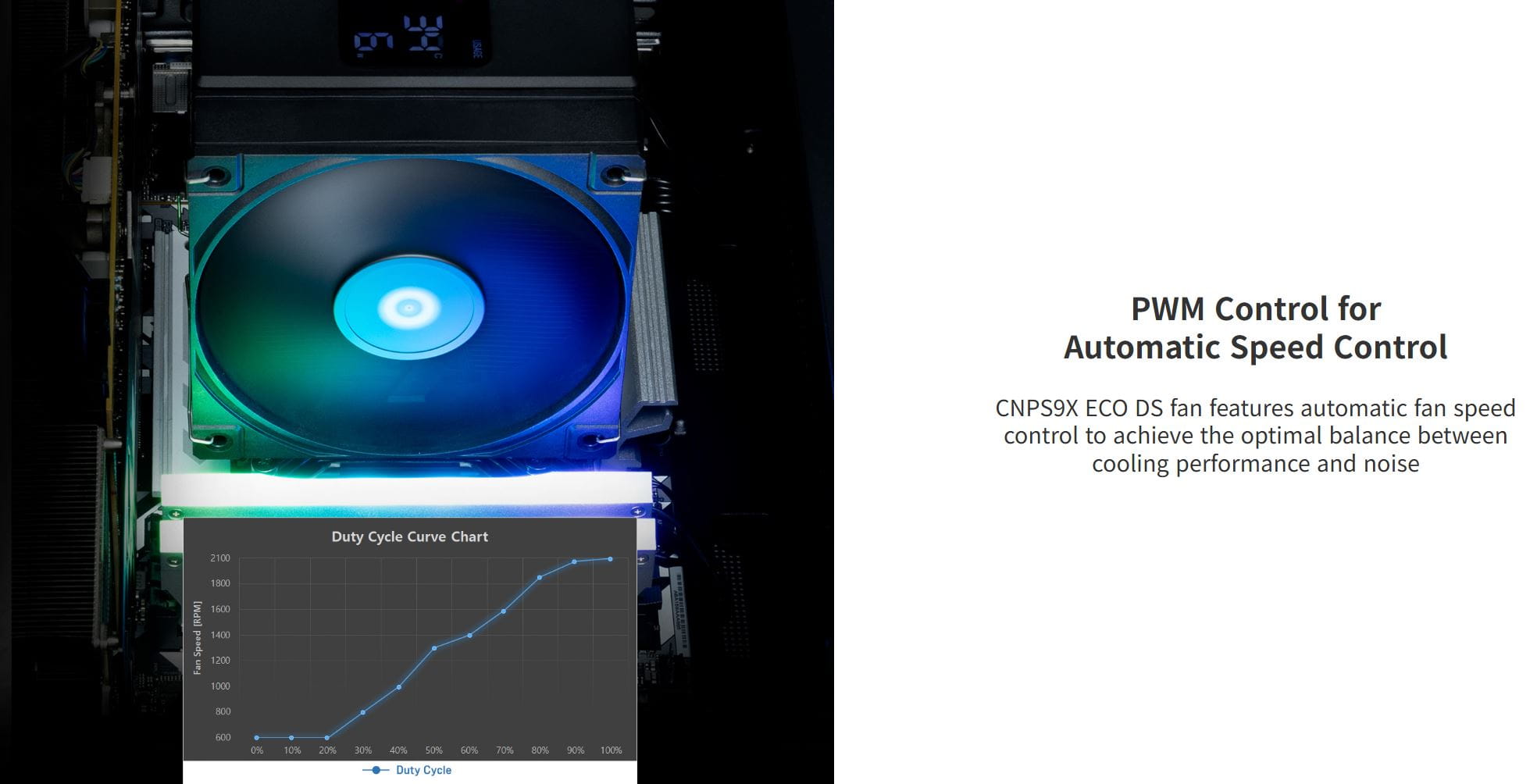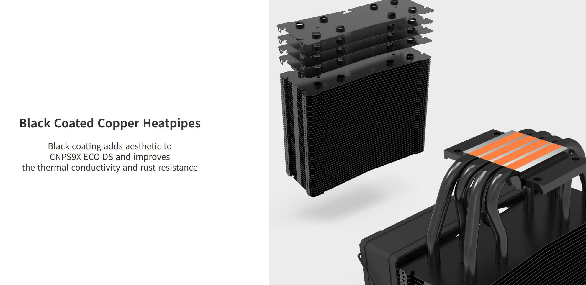 Mit einer Kühlleistung von bis zu 190 Watt TDP ist der CNPS9X ECO DS für leistungsstarke Prozessoren bestens geeignet. Die vier schwarz beschichteten Heatpipes nutzen Direct Touch Heatpipe (DTH)-Technologie, um Wärme direkt von der CPU aufzunehmen und effektiv an den Kühlkörper abzugeben. Ein langlebiger 120 mm PWM-Lüfter mit hydraulischem Lager sorgt dabei für den optimalen Luftstrom bei gleichzeitig leiser Geräuschkulisse (max. 27 dBA).