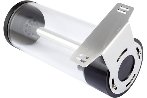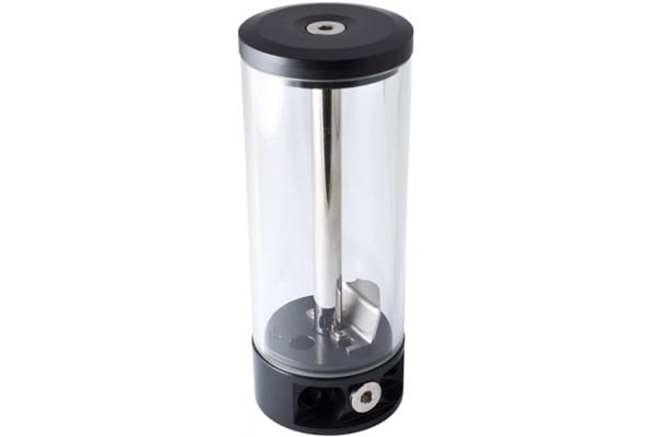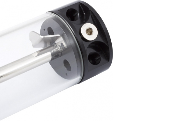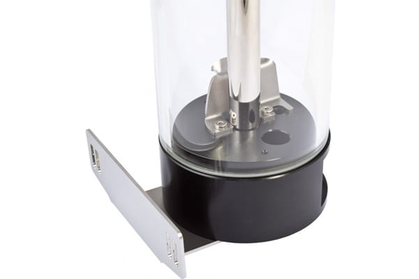 Die Ausgleichsbehälter der aqualis-Serie sind mit einer Röhre aus Borosilikatglas ausgestattet, das im Gegensatz zu dem häufig für Röhren-Ausgleichsbehälter eingesetzten Acrylglas eine sehr hohe Härte und Kratzfestigkeit, eine sehr geringe Wärmeausdehnung und eine hervorragende chemische und thermische Beständigkeit aufweist. Die Glasröhre der 450ml und 880 ml Varianten hat einen Außendurchmesser von 75 mm und eine Wandstärke von 5 mm. Sockel und Deckel der aqualis-Serie sind aus Delrin gefertigt, verbunden werden Deckel und Boden durch ein Edelstahlrohr. Ein optisches Highlight ist der integrierte Wassersäuleneffekt. Wird die Rücklaufleitung an den mittigen Anschluss des aqualis angeschlossen, strömt das Wasser durch die mittige Edelstahlröhre zum Deckel und tritt dort durch acht Öffnungen aus, was insbesondere in Verbindung mit Beleuchtung einen echten Blickfang darstellt. Eine dünne Acrylglasplatte nahe am Boden des aqualis vermindert den Lufteintrag in den Kreislauf auf ein Minimum. Alternativ kann der Rücklauf an einen seitlichen Anschluss angeschlossen werden, das Wasser strömt dann aus dem Boden in den Ausgleichsbehälter zurück. Für diese Konfiguration liegt ein Prallblech bei, das wiederum für eine gute Entlüftung des Kreislaufes sorgt.