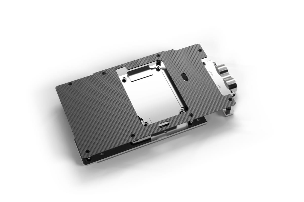 Durch die Verwendung einer dünnen und extrem stabilen Carbon Platte, konnte dieser als 1-Slot Kühler konzipiert werden, ohne beim Kupferblock Abstriche machen zu müssen. In Kombination mit den hinten platzierten Messinganschlüssen können mehrere Kühler problemlos übereinander oder im Servergehäuse nebeneinander gestapelt werden. Diese durchdachte Konstruktion spart Platz, vereinfacht die Verschlauchung und ermöglicht eine nahtlose Integration in den Wasserkreislauf.