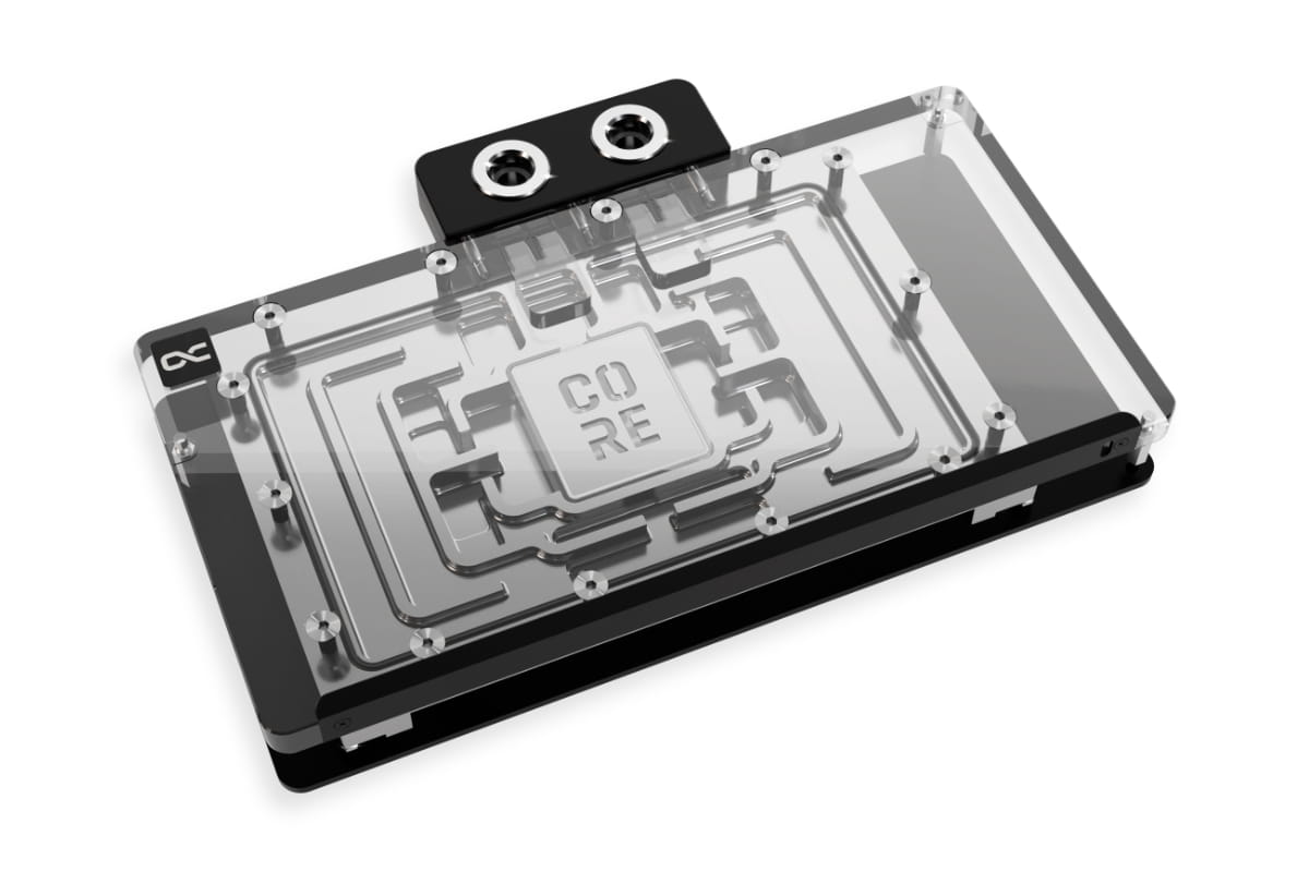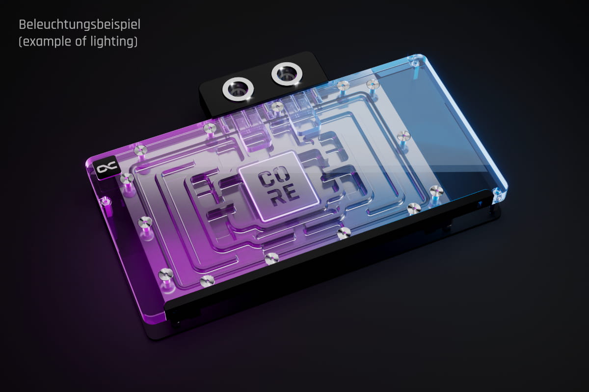 Die optische Gestaltung des GPU-Wasserkühlers wurde nur geringfügig verändert. Ein besonderes Highlight ist das neu hinzugekommene Core-Emblem über der Jetplate, dass die Zugehörigkeit zur Core-Serie unterstreicht und das Design visuell aufwertet. Die Serie setzt weiterhin auf hochwertige Messinganschlüsse, die optimale Qualität und Sicherheit garantieren. Die speziell angepasste Aluminium-Backplate bedeckt die komplette Rückseite des Kupferkühlers und sorgt für eine klare und einheitliche Optik. Das Acryl, in Kombination mit der aRGB-Beleuchtung, ermöglicht eine gleichmäßige und beeindruckende Beleuchtung des gesamten Kühlers.